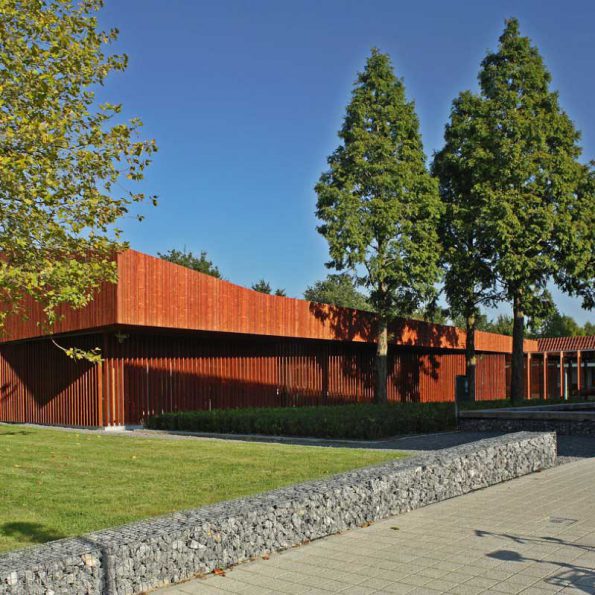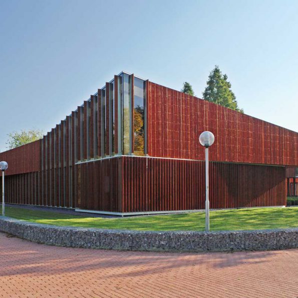 In de architectonische uitwerking voor de uitbreiding is aan de ene kant gezocht naar contrast met de bestaande bebouwing om gestalte te geven aan de exposure. Aan de andere kant is ge-zocht naar verwantschap met elementen uit de omgeving. De wijze waarop het object zich in landschap manifesteert en de referentie naar vorm en materiaal spelen hierin een belangrijke rol.