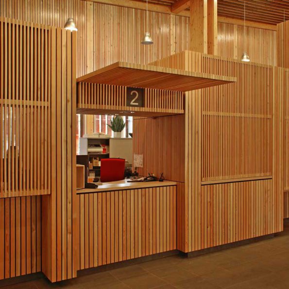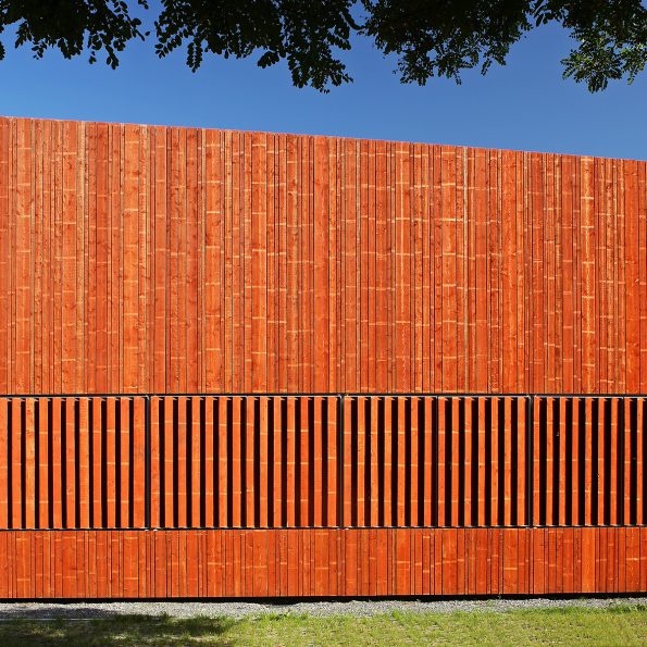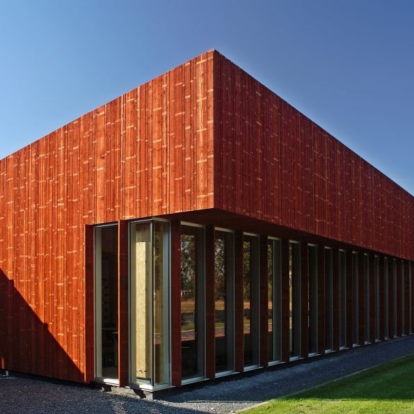 Vrij vertaald zou er gesproken kunnen worden van een veredelde schuur waarin hout en glas elkaar afwisselen. Niet een replica maar een verwijzing waarin oud en nieuw samengaan, met een meer formele nieuwe voorzijde en een informele utilitaire achterkant. Een plastisch volume dat zich onderscheid van de bestaande bebouwing door zín afwijkende materiaalgebruik maar ook door bewerkingen van het volume in de vorm van overkra-gingen en verhogingen. Bewerkingen die vanuit het programma voortkomen en niet alleen een esthetische achtergrond hebben. Zo is de overkraging bij de frontoffice een markering van de entree, fungeert de overkraging bij de bestuursvleugel als zonwering en bevat de verhoging boven de entree een aantal werkplekken.