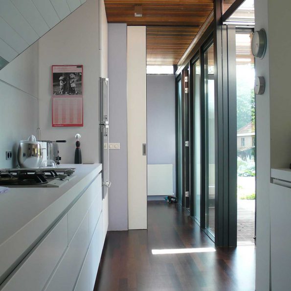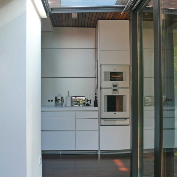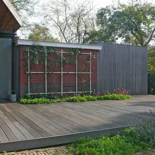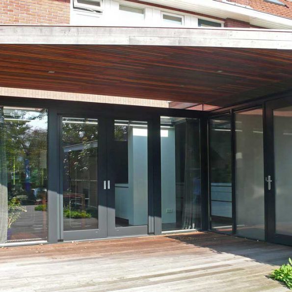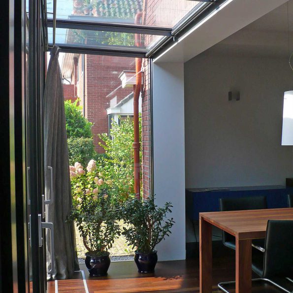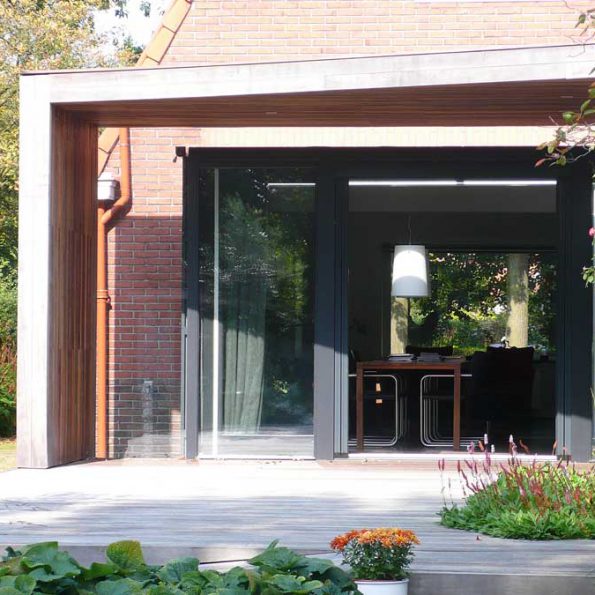 opdrachtgevers om een uitbreiding van de woonkamer annex keuken aan de zuidkant van de woning te maken. Naast de uitbreiding is er de vraag naar een beschutte buitenplek.