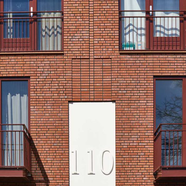 Een derde ‘portieketageblok’ wordt ongeveer halverwege de 120m lage nieuwe gevelwand geplaatst en benadrukt het nieuwe principe van de invulling. Het detailniveau is sober en alleen de plint met hoofdentree en de boven beëindiging van de gevel onttrekken zich hier aan. Samen benadrukken zij de symmetrische opzet van de portiekontsluiting. De maat van de verkaveling van de stadsvilla’s komt terug in verticale ‘kopstroken’ in het metselwerk. De kozijnen kleuren mee met het metselwerk en worden naar boven toe lichter.