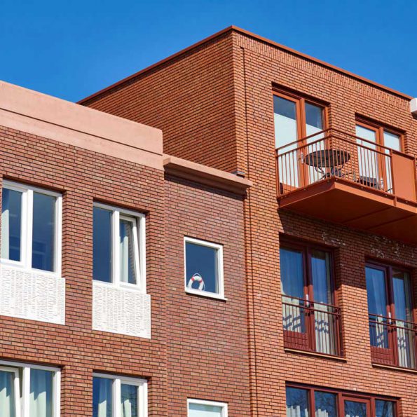 De fasering en marktdifferentiatie wordt aangegrepen om de gevelwand -in hoogte en maat zichtbaar anders te laten zijn dan de naastgelegen delen van het bestaande bouwblok. De nieuwe gevelwand is als een soort ‘lade’ in het bestaande bouwblok geschoven. De rooilijn ligt een kleine meter terug om dit effect te versterken en ruimte te geven aan een overgangszone naar het wonen. Prive ‘stoep’ -een trede verhoogd- en noodzakelijke balkons van de appartementen worden daarmee ondergeschikt aan de openbare ruimte van de kade.
