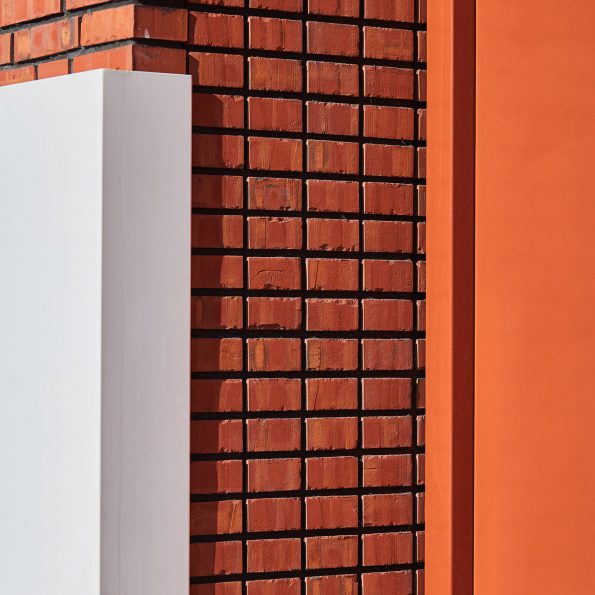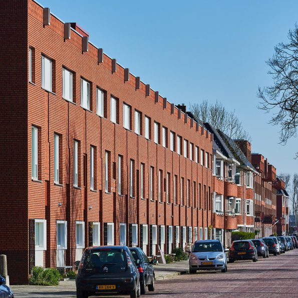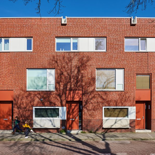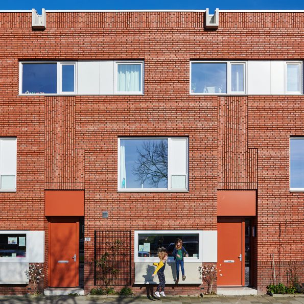 Een prefab gevelbank en spuwer in de dakrand versterken dit en de plasticiteit van de gevel. Een teruggeplaatste entree benadrukt de individuele woning in een stedelijke situatie en vormt een stapsgewijze overgang van privé naar openbaar. De entree kleurt mee met het metselwerk dat hier vertikaal gebruikt wordt. Zij verwijst naar de verticaliteit van de portiekstructuur in de buurt. Extra ramen die optioneel gekozen kunnen worden voegen zich in deze zone. Deze opzet maakt verandering van woon- en werkprogramma per woning mogelijk met behoud van de collectieve uitstraling.