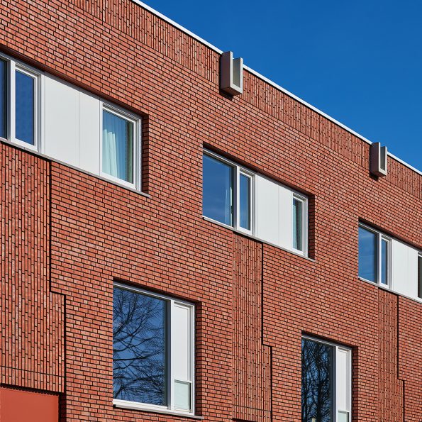 De gevel van ieder basistype is in hoofdopzet opgebouwd uit drie verschillende ‘raamsoorten’ die op een specifieke manier zijn gebruikt. Op de begane grond een smal hooggeplaatst horizontaal raam, daarboven een groot laaggeplaatst vierkant raam op de eerste verdieping en op derde laag twee kleine ramen. Onderling zijn zij in het gevelvlak verschoven met verschillende negge’s en gesloten zijpanelen. Al deze elementen zijn in contrast met het Groningsrode metselwerk in wit uitgevoerd en maken een sterk horizontale ritmiek.