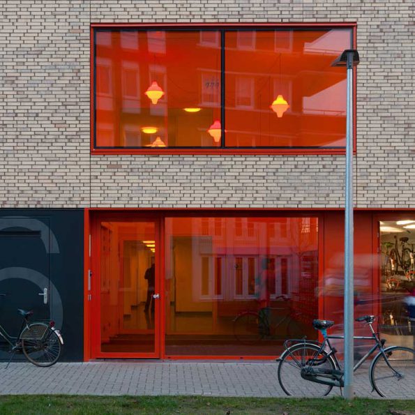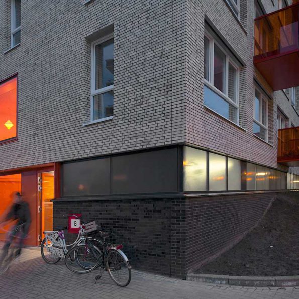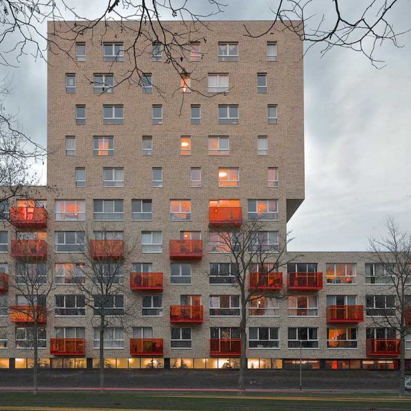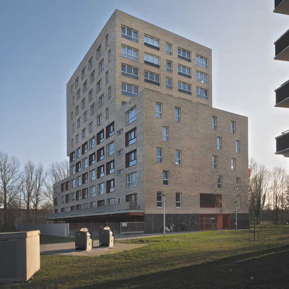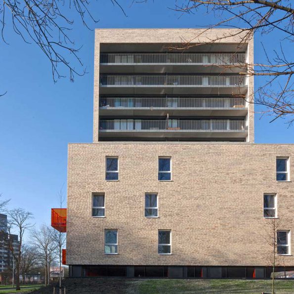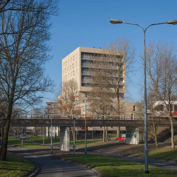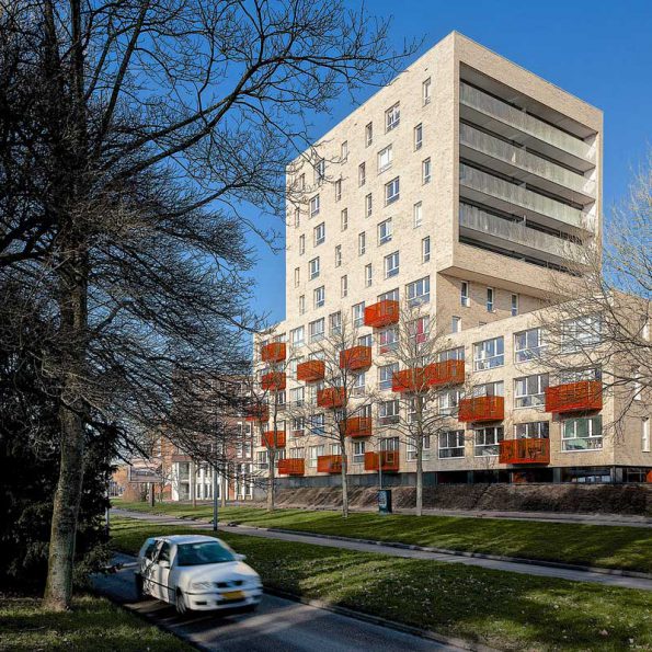 De appartementen op de 1e t/m 5e verdieping zijn georiënteerd op de Zonnelaan, die op de 6e t/m 11e verdieping ontrekken zich aan het maaiveld en richten zich boven de boomkruinen op het zuid-oosten en het noordwesten. Deze verdraaiing komt in de gevel duidelijk tot uitdrukking door de omkering in omvang van de gevelopeningen. De parkeer- en entreelaag is, zoals aangegeven in het stedenbouwkundige plan, ingebed in een talud van 1,5 m hoog. Deze laag is aan de oostzijde omzoomd door een haag en wordt onder het bouwblok voorzien van een strook strekmetaal als ‘voeg’ tussen het talud en het gebouw.