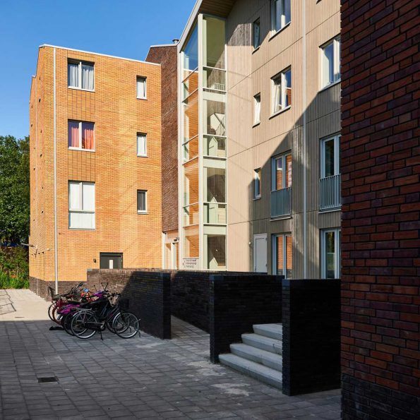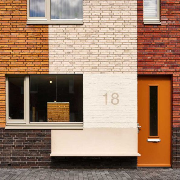 Het programma op de begane grond heeft een heldere relatie met het maaiveld. Bij de grondgebonden woningen wordt de entree gemarkeerd door een verticale strook metselwerk en de voordeur met daarnaast een in de gevel opgenomen betonnen zitelement.