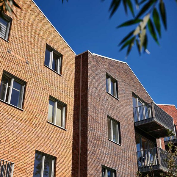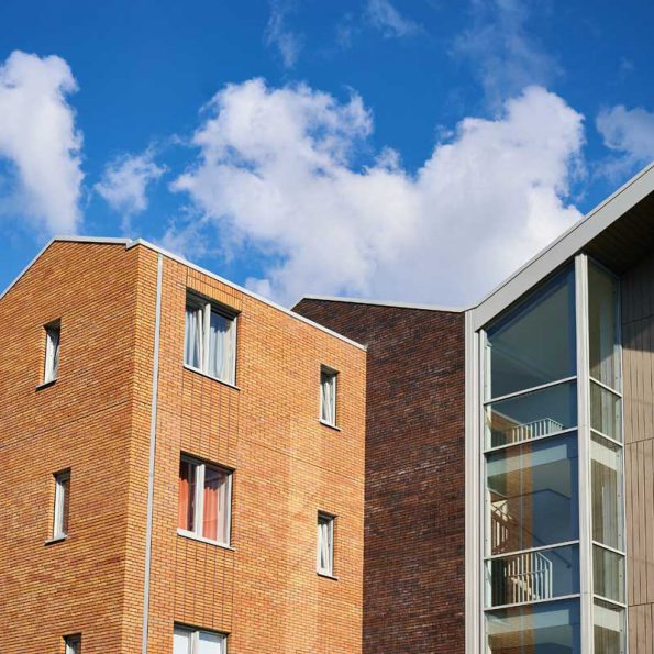 De gevelopbouw van de appartementen is een afwisseling van grote openingen t.p.v. de balkons en relatief kleinere ramen waarbij accenten van metselwerk met afwijkend metselverband bijzondere posities markeren.