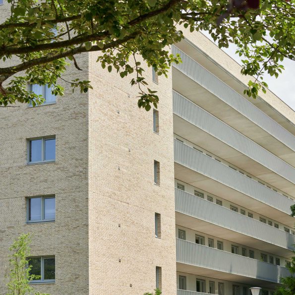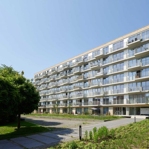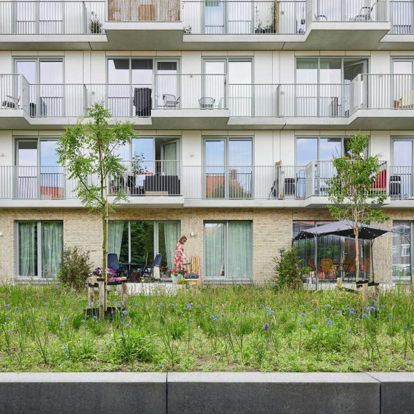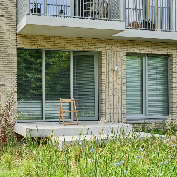 Op de begane grond zijn de kaders teruggebracht naar de maat en schaal van het afzonderlijke appartement, hiermee wordt een plint gevormd waarbij de buitenruimte aan middels betonnen ‘stepstones’ wordt gevormd.