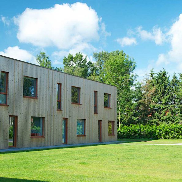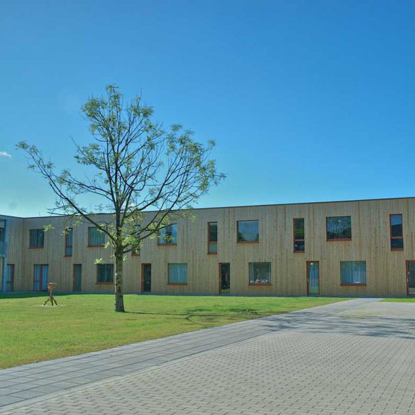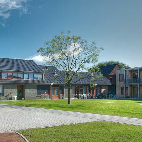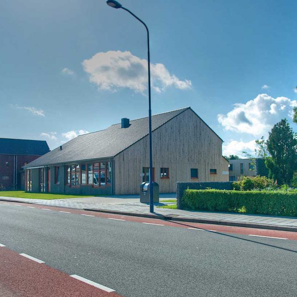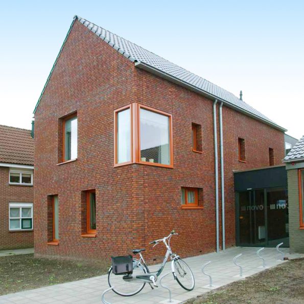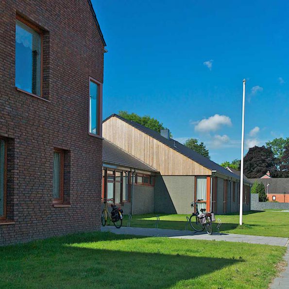 De nieuwbouw is ten opzichte van de bestaande bebouwing onderscheidend uitgewerkt. Een plat afgedekt en donker gematerialiseerd tussenvolume vormt een schakel tussen de nieuwbouw aan de voorzijde, achterzijde en de bestaande bebouwing. De gevels van de nieuwbouw worden aan de buitenzijde voorzien van donkerrood metselwerk en aan het binnenhof en de buitengalerij aan de zuidzijde van gevelbetimmering van onbehandeld gemodificeerd vuren (Plato).