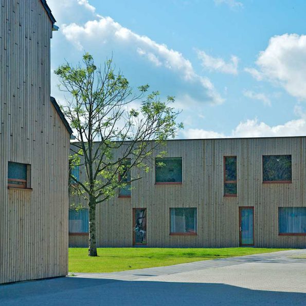 De metselwerk gevels van de bestaande bebouwing worden voorzien van een antraciet keimlaag en de ‘snede’ ontstaan na de gedeeltelijke sloop van onbehandeld gemodificeerd vuren.