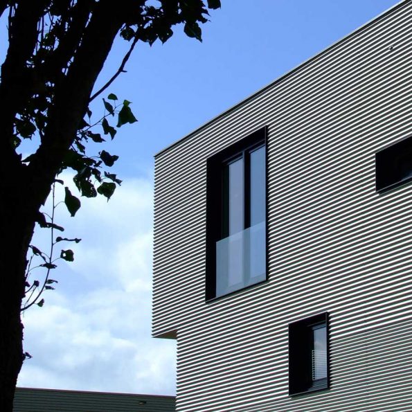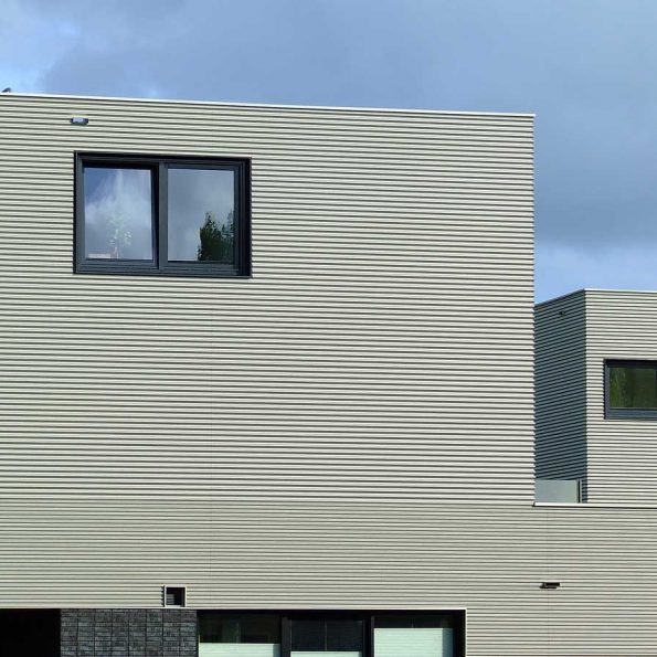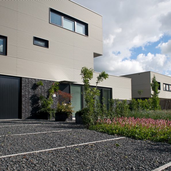 Het horizontale karakter in de materialisatie van het project is doorgezet tot in de detaillering. De baksteen is op de hoek van de woning onder verstek gezaagd en ook de golfen van de metalen gevelplaat lopen door middel van een schuine plaatbeëindiging de hoek om. De veelsoortige gevelopeningen worden uit de beplating in een scherp kader uitgesneden en zijn aanleiding om de profielhoogtes van de gevelbekleding te wisselen. De diversiteit in volumieke opbouw en de gevelcomposities van de afzonderlijke woningen worden hierdoor verbonden.