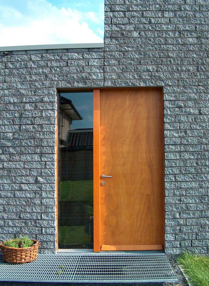 Het voorhuis is meer gesloten en keert zich op de begane grond af van de naastgelegen ontsluitingsweg. Een dubbele garage die eigenlijk meer is, en een studeer- en werkkamer zijn hier de belangrijkste functies. De speelkamer voor de kinderen in het tussenlid is vooral gericht op de patio.