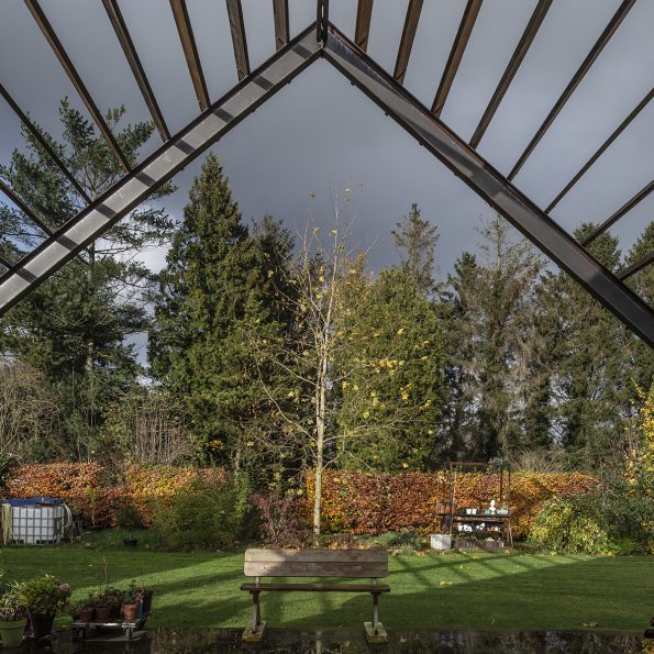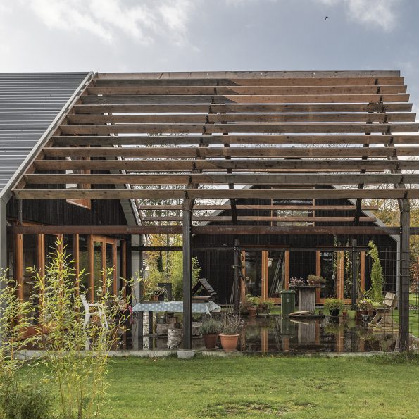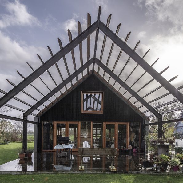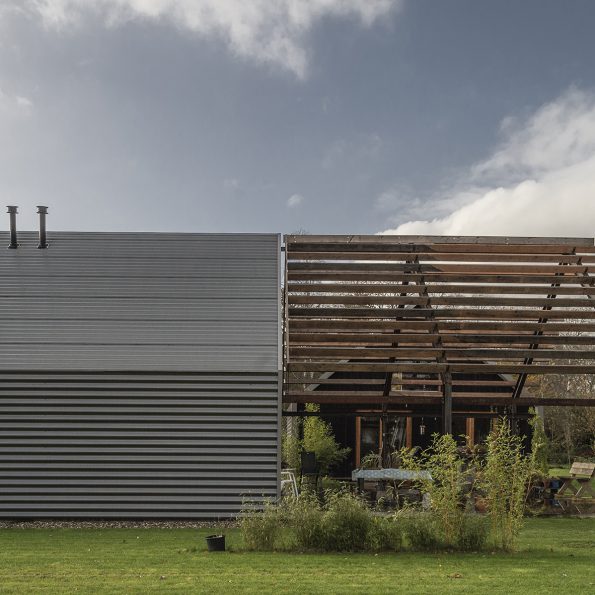 Het bijgebouw in de vorm van een schuur zal gebruikt worden als werkplaats en foto atelier en cursusruimte. Kwalitatief is de schuur identiek aan het woonhuis. De architectonische uitwerking is gericht op het gebruik van een eenduidige elementaire hoofdvorm die herhaald wordt. Schuur en huis kennen hetzelfde principe. Hiermee voegt het plan zich in de schaal en maat van het aanwezige landschap. Het materiaalgebruik en sobere detaillering versterken dit. Het huis als hoofdgebouw onderscheidt zich door elementen die bewoning zichtbaar maken, toe te voegen. Een schoorsteen, vensters in het dak voor daglicht en grote openingen in de kopgevels van zwart hout.