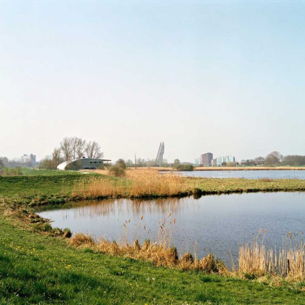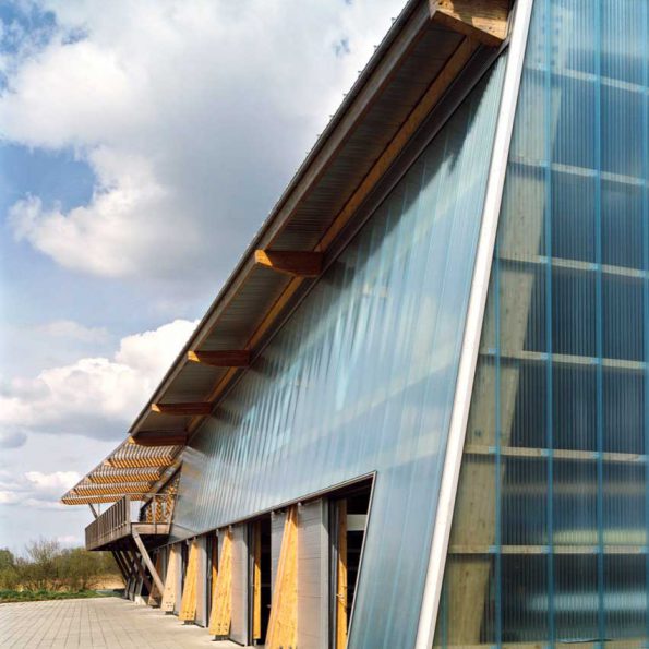 Daarnaast is er gekozen voor een uitgesproken vorm, contrasterend maar daardoor juist heel eigen in het landschap, zowel in materiaal als in vorm. Een duidelijke vorm waar insneden zijn gemaakt t.p.v. toegangen en een uitkraging als terras. Het schuin uitkragende dak aan de waterzijde dient als aanzet tot de zonwering in de vorm van de houten lamellen boven het terras bij de kantine. Elementen die een nadrukkelijke vorm hebben maar bovendien functioneel zijn.