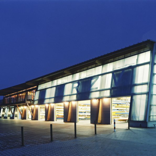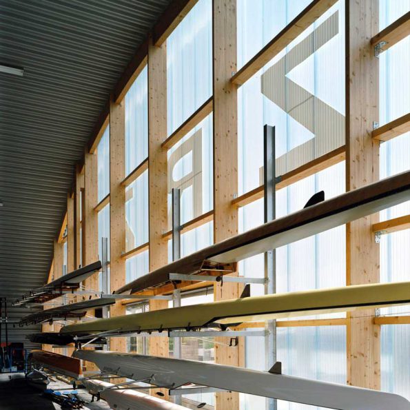 In de materiaalkeuze is er m.b.t. de hoofddraagconstructie gekozen voor houten gelamineerde spanten en kolommen. Dit sluit goed aan bij de sfeer van watersport en is onder deze omstandigheden ook relatief onderhoudsarm. Het gebogen dak moest één gekromd vlak worden zonder horizontale lijnen. Door aluminium dakprofielen op het werk te produceren was het mogelijk platen van 22 lengte te gebruiken. Om de hoofdvorm zo eenvoudig mogelijk te willen houden hebben we gekozen voor 1 gevelmateriaal (op de deuren na). 1 materiaal dat tevens transparant moest zijn zonder de nadelige invloeden van direct zonlicht (warmte uv-straling etc.). De transparantie was een belangrijk thema omdat de botenloods toch beschouwd mag worden als de schatkamer van een roeivereniging, het visitekaartje. De tegenstelling met aan de ene zijde de schijnbare kwetsbaarheid van het materiaal en aan de andere zijde het willen tonen van de boten is verbeeld met als resultaat s’avonds een lantaarn en overdag een met daglicht overladen loods.